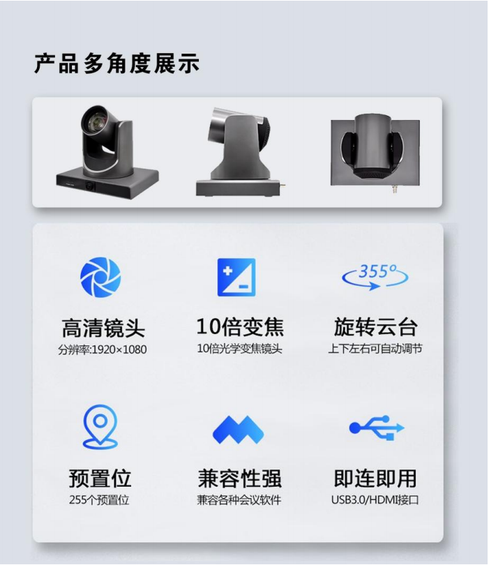 一体化集成设计,可同时输出全景和特写 4 路高清 1080P 视频。